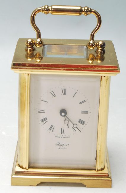 A vintage mid to late 20th Century Rapport London brass cased carriage clock having bevelled glass panels to the dies and exposed movement, swing handle to the top, all raised on bracket feet.