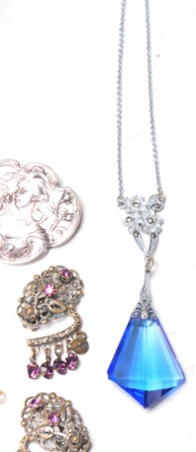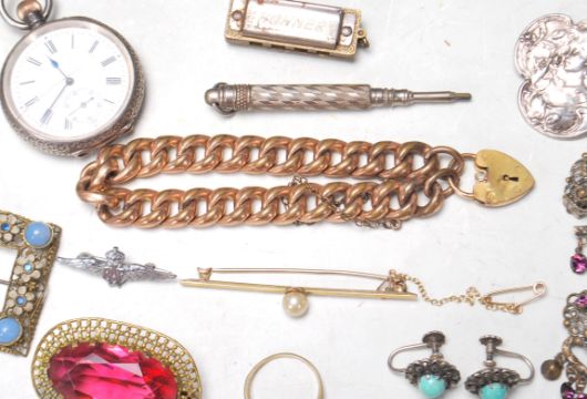 A vintage 20th century jewellery box with contents to include gold plate jewellery, white metal and silver jewellery, enamelled beaded necklace, RAF badge, brooches etc.
