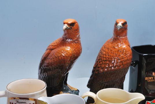 A large collection of vintage retro pub advertising ashtrays, jugs, pump mounts and bar towels. The collection contains brands such as Harp, Old Parr, Bank's, Ballantine's, Remy Martin, Poacher Bitter, Eden, Harvest, Squires Gin, Finlandia Vodka and more. Comes together with two golden eagle Beneagles whisky decanters.  Of Breweriana interest. Measures 26 cm tall.