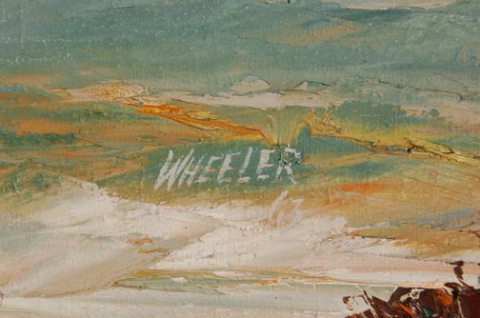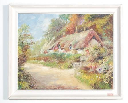 Wheeler 63. A mid century retro oil on board painting of a cottage together with another, both being signed and dated to the corner. Set within the original mid century frame. Also a print with notation to verso. Measures 180 x 72 cm.