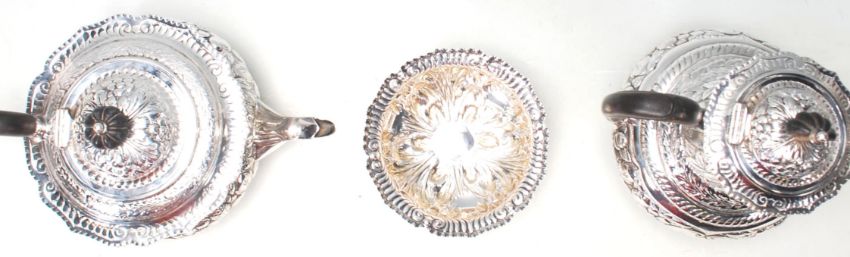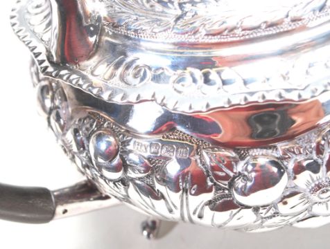 An early 20th century Edwardian silver hallmarked 1904 three-piece tea set comprising of a teapot with ebonised handle and finial, hot water jug / coffee pot with ebonised handle and finial ( damage finial / missing half of the finial ) and a sugar bowl. All having embossed repousse decoration and twin cartouche to the sides raised on hoof feet. Silver hallmarks for Sheffield 1904 ( M ) by Henry Atkin / Atkin Brothers. Total gross weight:1420g