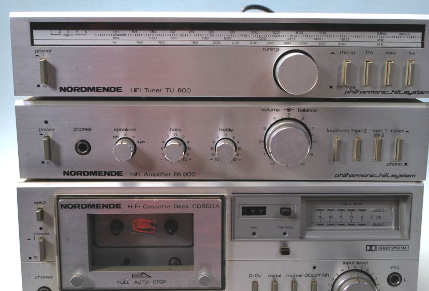 Hi-Fi - A good three part philharmonic stacking system by Nordmende comprising a Tuner TU 900, Amplifier PA 900 and a Cassette Deck CD950A. All finished in a silver colourway.