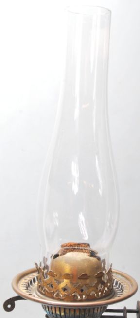 A Victorian 19th century oil lamp with a moulded and hand enamel painted blue glass reservoir decorated with flowers over a Corinthian column support set on an ebonised stepped base. Measures 64 cm tall.