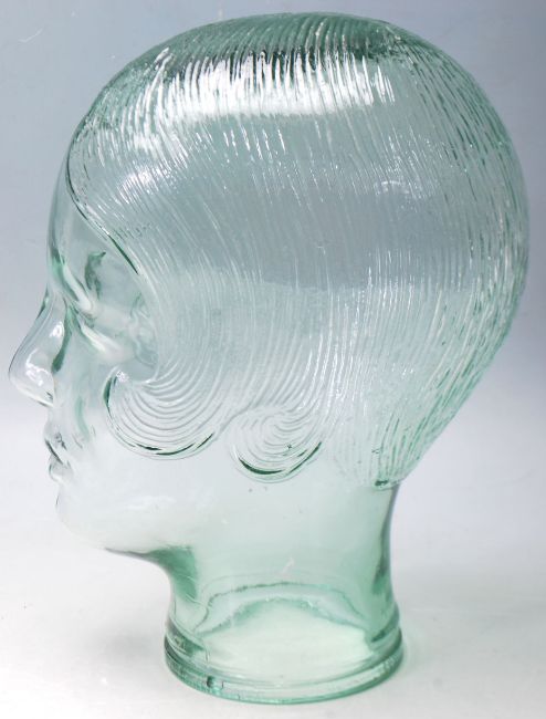 A 20th century art deco style moulded pressed glass phrenology type female head - shop display stand / millinery mannequin head. Moulded and pressed glass of clear with moulded male features.  Measures 25 cm tall.