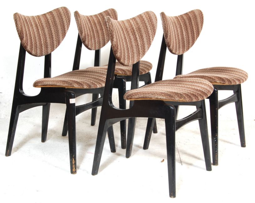 G-Plan Furniture. A set of 4 1960's G-Plan teak and ebonised butterfly shaped dining chairs with ebonised frames and overstuffed seats. Measures 77cm high x 43cm wide x 46cm deep.
