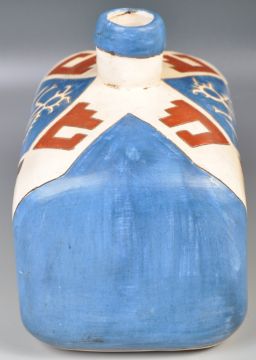 Manepu Chile - A unusual mid 20th Century retro vintage pottery vase / lamp base of squat form by Manepu Chile. The vase having red and black geometric patterns on white and blue ground with central cartouche panels depicting figures. Measures 20cm x 24cm x 15cm.
