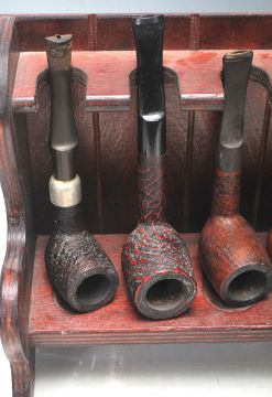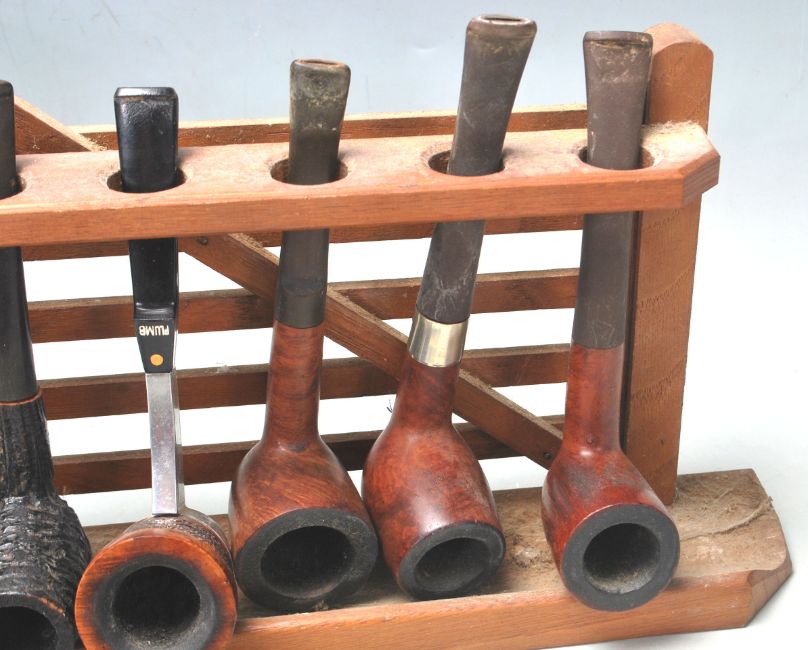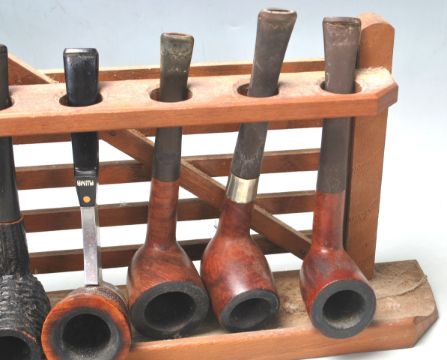 A collection of twelve vintage 20th century smokers pipes tobacciana having wooden shanks and bone  stems. To include Peterson’s, Eldorado - Dr Grabow,  Hardcastle’s, Monica, Peterson’s - Gold Block, Peacemaker 5 England, Londoner 428S, Medico, Made in Czechoslovakia, etc. Measures 15 cm long.