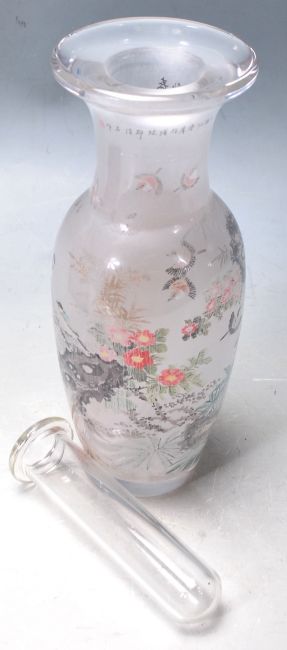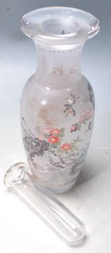 A 20th century frosted clear glass and handpainted vase with stunning famille rose decoration with scenes of birds and flowers. Complete in the original silk lined decoration fabric lined presentation box.