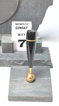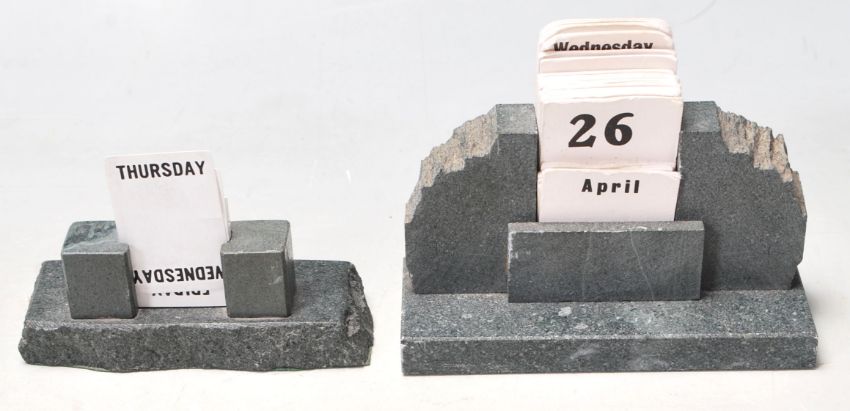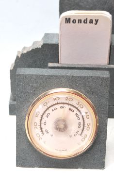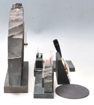 A vintage late 20th century hand made green slate desk set. To include a good mantel clock, barometer, pen holder and two calendars with paper dates.