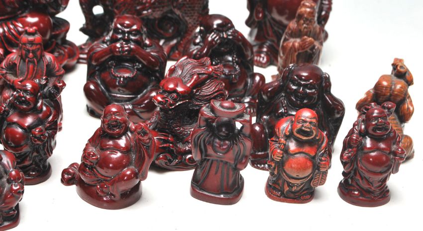 A  large collection of Chinese resin cast cinnabar coloured netsuke and okimono's to include Buddha in various form, deity. temple dogs / dogs of fo, Qilin and others figures. Measures 11 cm tall.