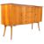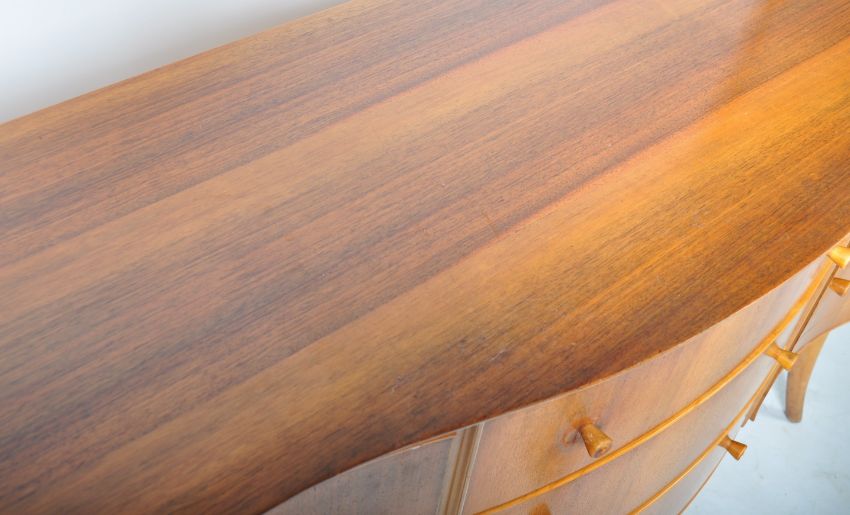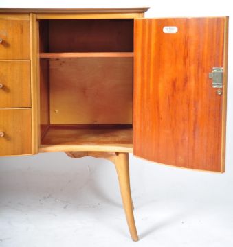 Beere Bros Ltd Furniture - A mid 20th century light golden oak retro vintage golden light oak sideboard credenza of shaped serpentine form having a central bank of three drawers flanked by cupboards. All raised on shaped supports.
