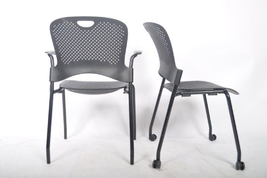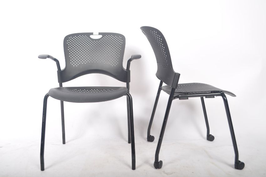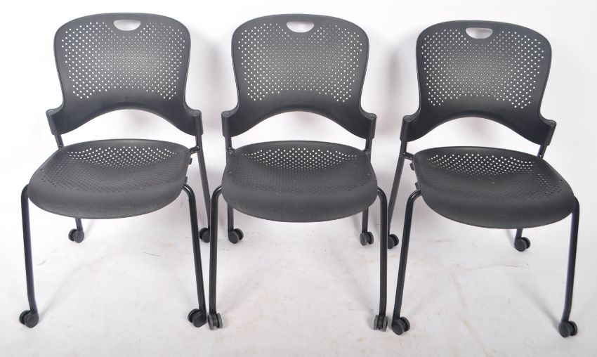 Herman Miller - Caper - A good group of six contemporary stacking office desk chairs by Herman Miller the 'Caper' Chair. One chair bearing armrest with all constructed form moulded plastic and being raised on castors. Marks to underside of each chair. Armchair example not raised on castors. Armchair 82cm x 50cm x  51cm.