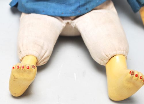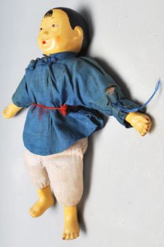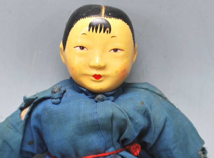 An antique early 20th Century Chinese composite paper mache figurine of a Chinese girl dressed in a period silk outfit. No makers marks. Measures 25 cm long.