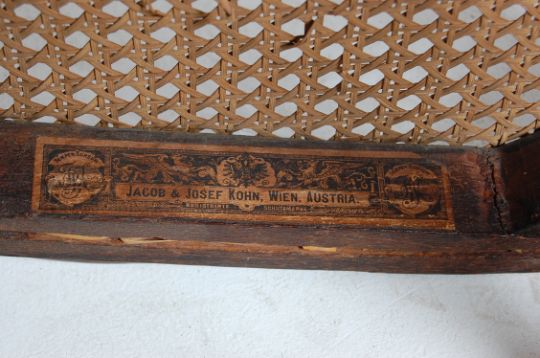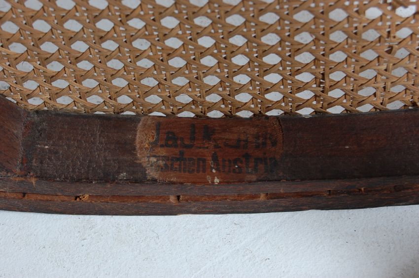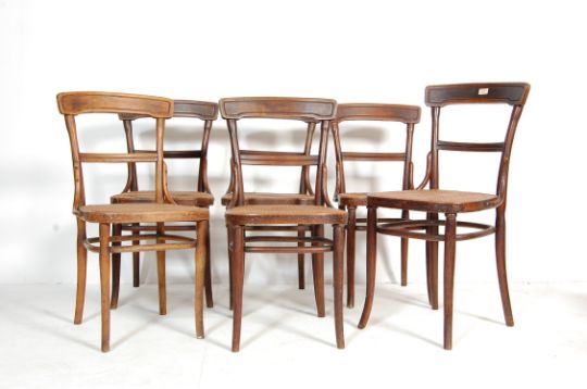 A set of six Austrian Bentwood and cane panel  seat chairs / dining chairs / coffee chairs, by Jacob & Josef Kohn of Wsetin, Austria, the curved shaped back and carved detailing, cane panels shaped seat, on turned and splayed legs. Makers stamp and paper label to seat rail "J. & J. Kohn, Wsetin - Austria. Measures 90 H x 40 W x 40 D cm.
