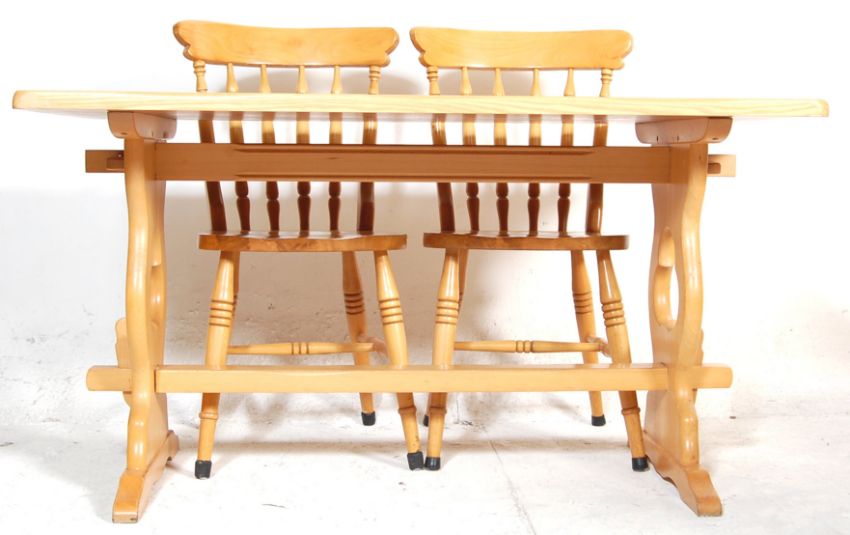 A late 20th century vintage oak dining table and chairs. Old Colonial style light oak dining table and four chairs with curved back rest with turned spindles raised on turned supports. Measures 74cm x 176cm x 76cm.