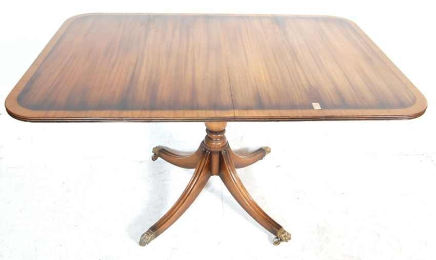 An antique style late 20th century mahogany and satinwood inlay regency revival dining table having a drop leaves set on a splayed base raised on brass cap castors together with four rail back dining with drop in cushions. Measures 80 x 148 x 92 cm.