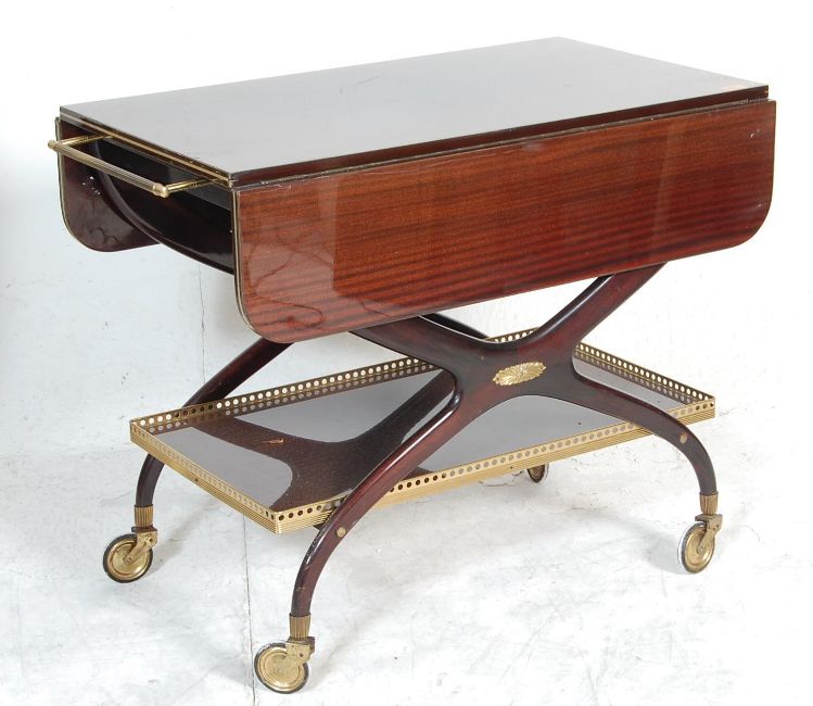 An amazing vintage 20th century Art Deco style mahogany butlers trolley. The trolley having two drop leaf, cross stretchers under tray with brass gallery and pierced decoration raised on large casters.