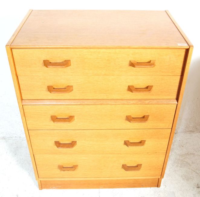 E. Gomme- G Plan- Brandon Range - A vintage mid century golden oak chest of drawers, having a 2 over 3 drawers configuration with raised handles and raised on a plinth base. Measures: 100cm high x 76cm wide x 50cm deep