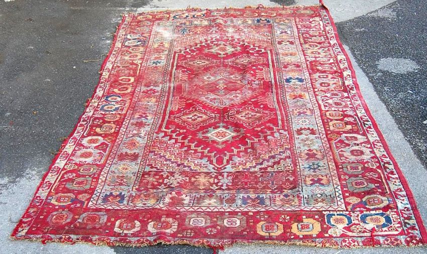 A large early 20th century handwoven Persian - Islamic rug having a red ground with geometric spandrels and borders / corners etc all with medallions to the centre.