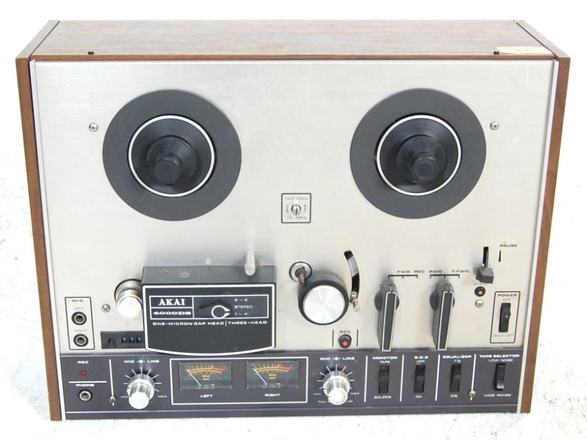 A retro 1970's vintage AKAI 4000DS reel to reel tape recorder player - One Micron Gap  Head - Three Head in faux wood surround with silver facia . pioneer cs-454 teak wood speakers. Measures: 52cm high x 30cm wide x 24cm deep.