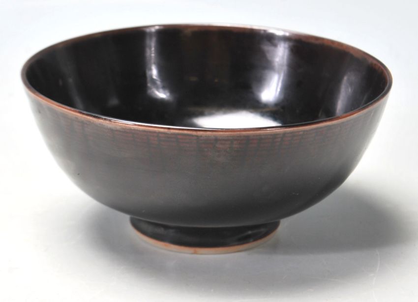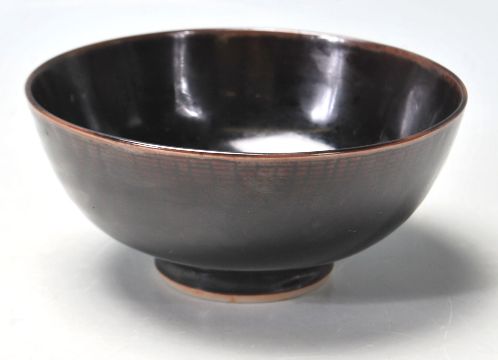 An early 20th century ceramic porcelain Japanese rice bowl raised circular foot with unusual dark brown colour way. Makers marks underside. Diameter: 20 cm.