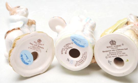 A collection of three Royal Albert, The World of Beatrix Potter ceramic figures to include Benjamin ate a lettuce leaf, Peter with Daffodils and Mrs Ribby. All in original boxes. Measures approximately 10cm tall.