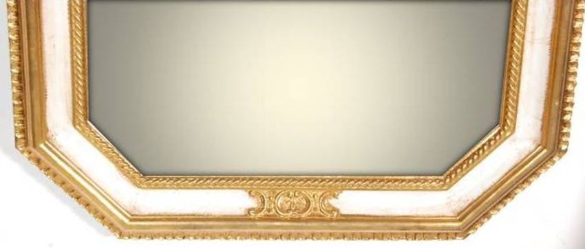 A mid century antique style hexagonal wall mirror / wall hanging mirror. The mirror having embossed gilded decoration to the margin