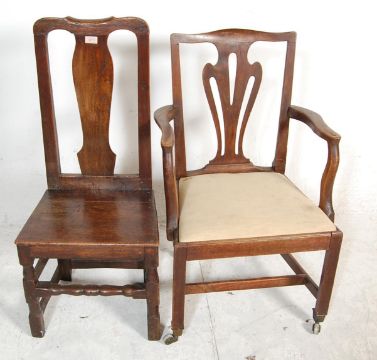 Two 19th century Victorian oak chairs. One having arched backrest with single shaped splatter, periodic wooden seats shaped supports united by stretchers along with a 19th century carver chairs with shaped armrests, square supports united by stretchers with brass casters. Measures 99 H x 45 W x 37 D cm.