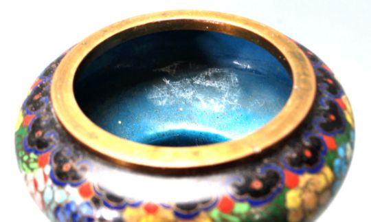 A good Chinese cloisonne enamel and brass mounted vase. The heavily enamelled vase raised on wooden socle plinth base. Of unusual shape with flanged body under waisted gu shaped neck with open top of circular form. The enamelled body heavily detailed with chintz pattern flower heads all over. Measures 35 cm tall.