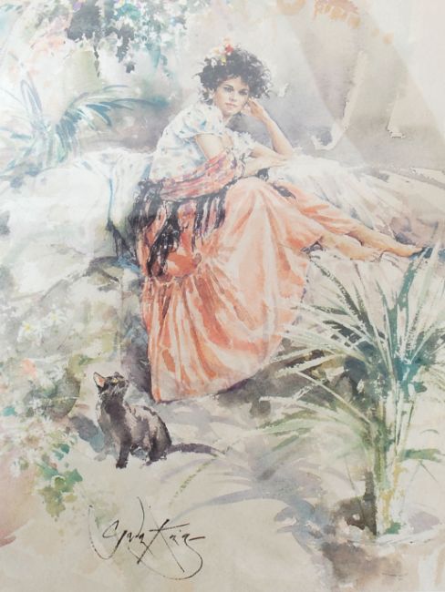 After Gordon King (1939-). A late 20th century signed print of a girl in a garden setting  reclining on a chair with a cat to her feet. Signed in pencil to the corner. 68/850. Framed and glazed. Measures: 69cm high x 55cm wide.