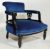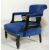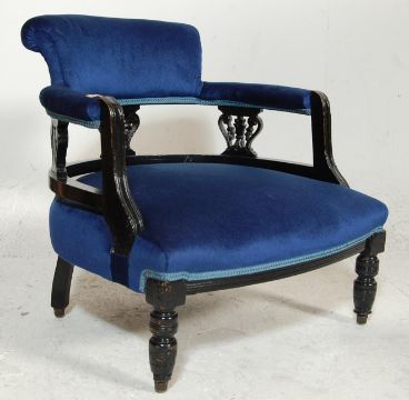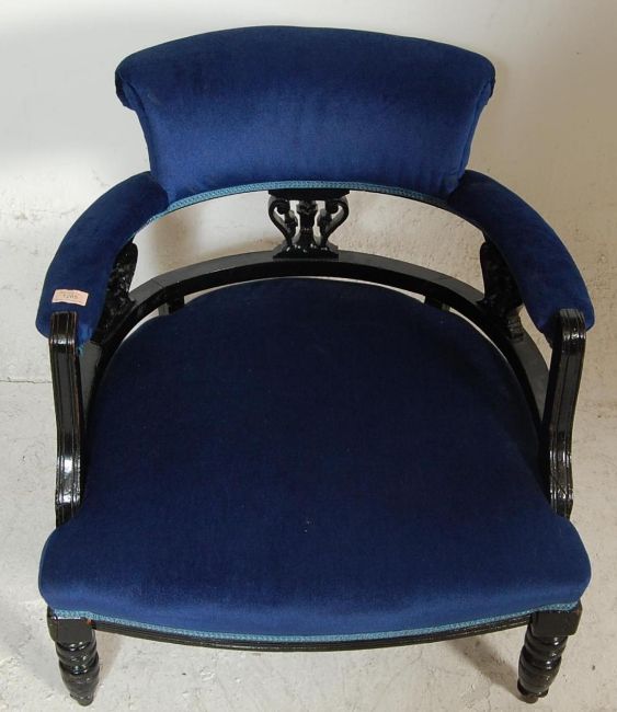 An Edwardian / late 19th century Victorian ebonised mahogany tub / salon armchair. Raised on turned legs with deep blue overstuffed seat and backrest having gallery edge, complete with upholstered elbow rests.Measures H 67 x W 64 x 60 D cm.