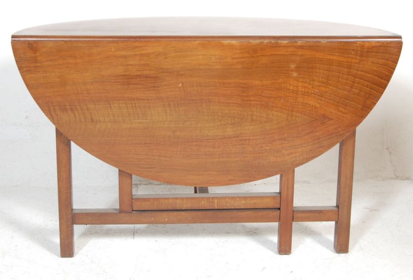 A vintage mid century plum mahogany drop leaf table having an oval top raised on a square gateleg supports. Measures 77 x 125 x 60cm.