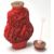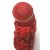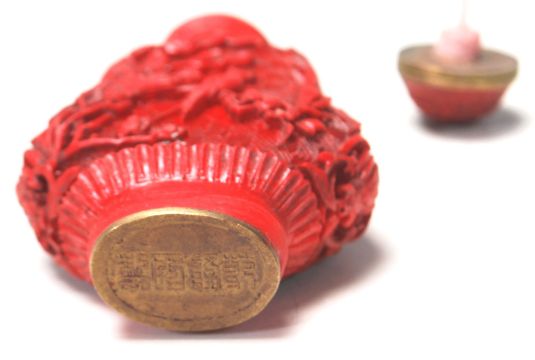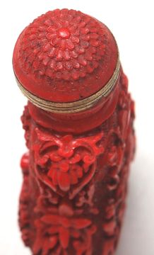 An 20th century antique Chinese red cinnabar snuff bottle carved with landscape scenes and carved stopper atop. Measures 7 cm tall.