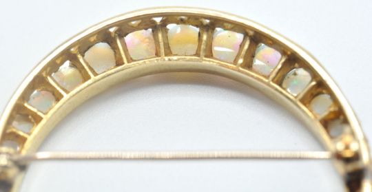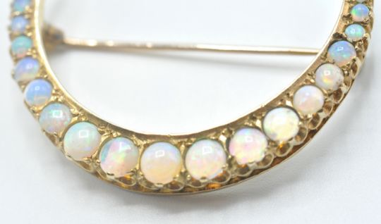 A 20th Century gold and opal brooch in the form of a crescent moon being set with round opal cabochons having a hinge pin and roll over clasp to the verso. Gold unmarked but tests as 9ct gold. Weight 6.3g. Measures 4cm wide.