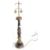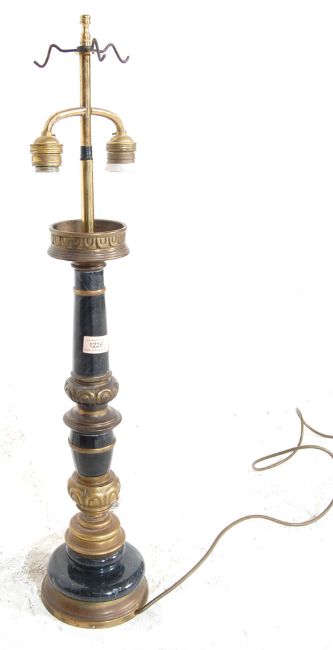A large 20th century antique style black marble and brass table lamp of tapered turned form, having a circular base and repeated decoration along the bronze. Measures H 79 x 19 cm diameter.