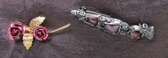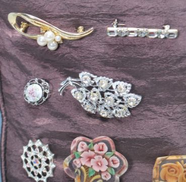 A collection of early 20th century and late 20th century vintage costume jewellery brooches to include white and yellow metal brooches, enamel brooches, marquise style brooches, plastic resins, floral motif, etc. All mounted on a pillow.