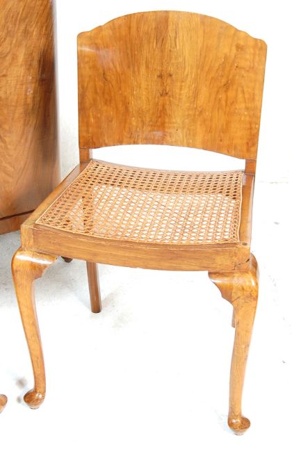 A 1930's Art Deco burr walnut bedroom suite. The suite comprising a dome top triple wardrobe compactum with haberdashery shelved interior together with a matching tallboy cabinet raised on cabriole legs with pad feet together with a bedside cabinet and a caned dressing table stool with panel back. 190 x 148 x 58 cm.