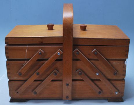 A vintage mid century metamorphic sewing box having a hinged lid, with three compartments  and dome handle to the top raised on block feet. Measures 19 cm high x 33 cm wide x 14 cm deep.