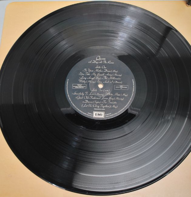 A collection of three vintage vinyl LP long play records by Queen to include Queen A Night at the Opera EMTC103 Jazz 6E 166B A Day At The Races EMTC104.