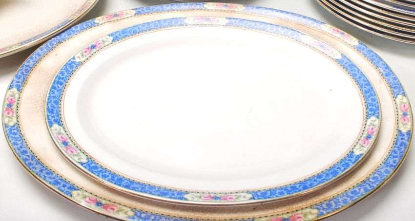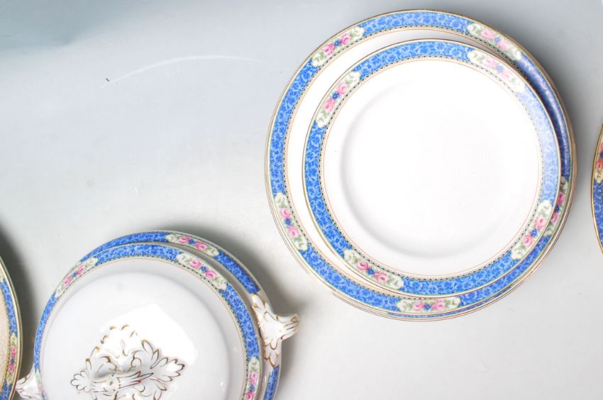 An early 20th century Booths blue and white Staffordshire part dinner service comprising a meat platter, tureen and dinner plates, gravy boat and other wares. Marked to the underside.