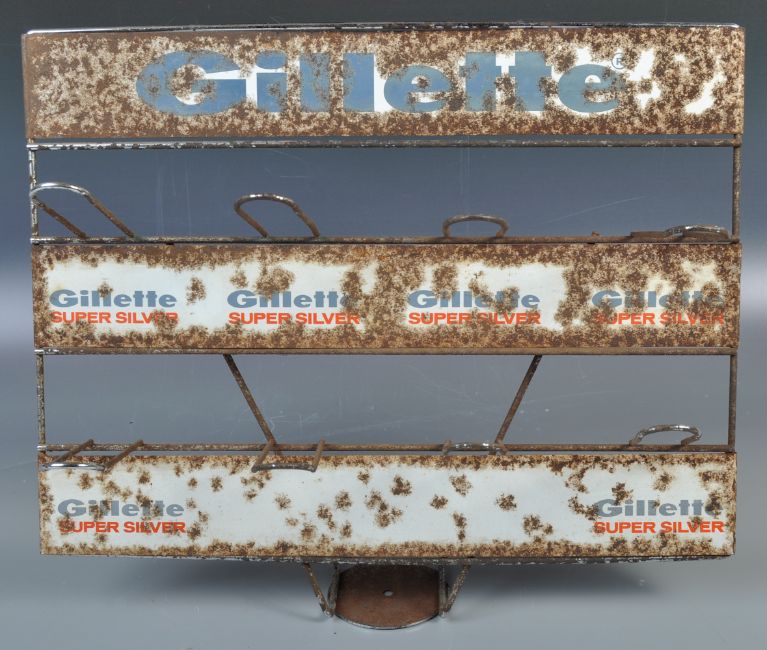 Gillette - A mid 20th Century retro vintage shop advertising point of sale display stand for Gillette 'Super Silver'. Chromed metal frame having three tin advertising strips with hanging rails all raised on a circular metal base. Measures 36cm x 41cm.