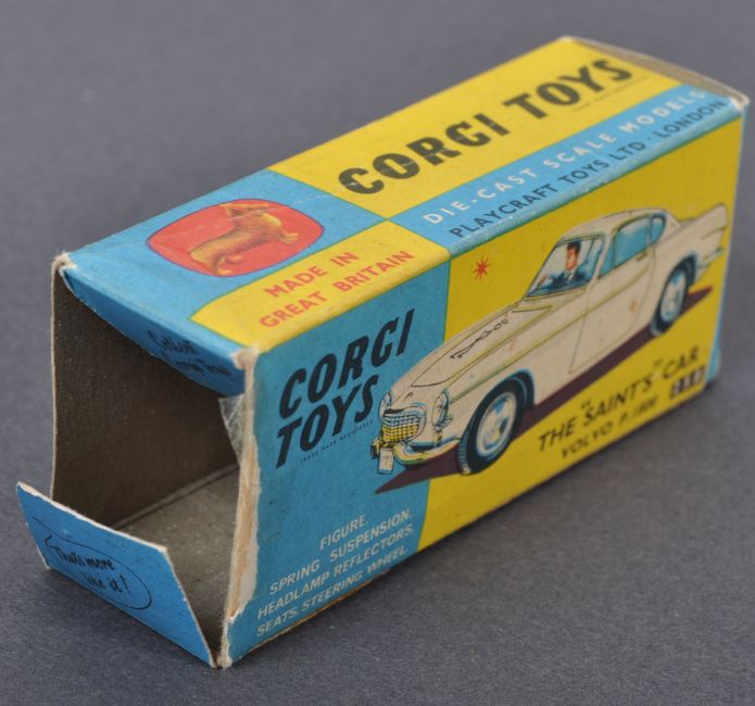 Two original vintage Corgi Toys made diecast model No. 258 ' The Saint's Car - Volvo P1800 '. Both white, with red interior with figure. Both in fair condition (one missing one headlight), and one supplied within its original box (missing an end flap). Great pair.
