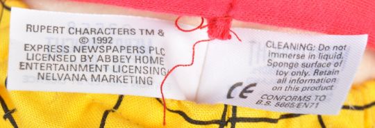 A rare and limited edition British made Merrythought Rupert bear soft toy teddy bear. The now retired bear having blonde mohair, black gloss eyes, stitched nose detail and fully jointed limbs. Dressed in red jumper, yellow checked trousers, matching scarf and white lace up shoes. Merrythought made in Ironbridge Shropshire label sewn to the back. Complete with original presentation box. Measures approx 50cm. Rare