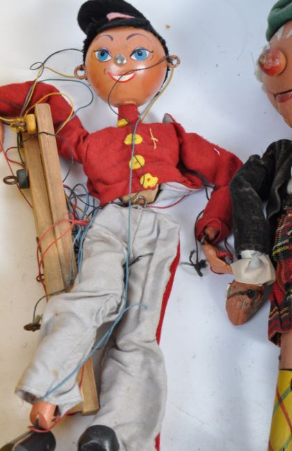 A Charming collection of original vintage Pelham Puppets vintage puppet marionette toys to include SS6 Clown in original box, SS4 Tyrolean boy in partial box, Caterpillar in partial box Mr Boozle and another. Great collection.