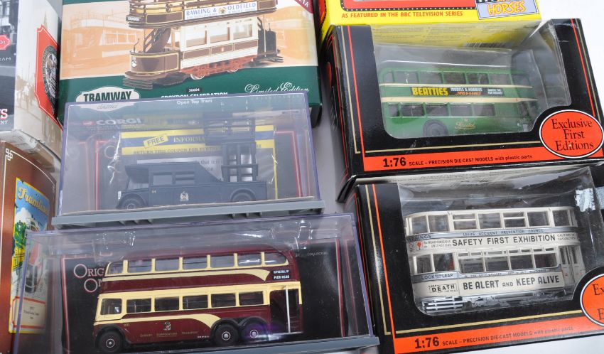 A large collection 20+ of assorted scale diecast models to include Only Fools and Horses Del Boys Reliant Regal Supervan III EFE 1/76 buses, Corgi Classics, Corgi Tramway / Tramlines, Cameo, Original Omnibus, Tower Tram kits etc. Great collection.