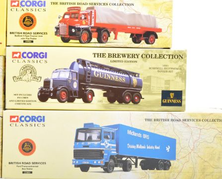 A collection of 8x Corgi Classics made boxed diecast model vehicles - largely Haulage / Haulier or Fire Engine interest. Includes model numbers; 98486, 98485, 23001, 22101, 19901 and others. Each appears mint and unused, within its original box.