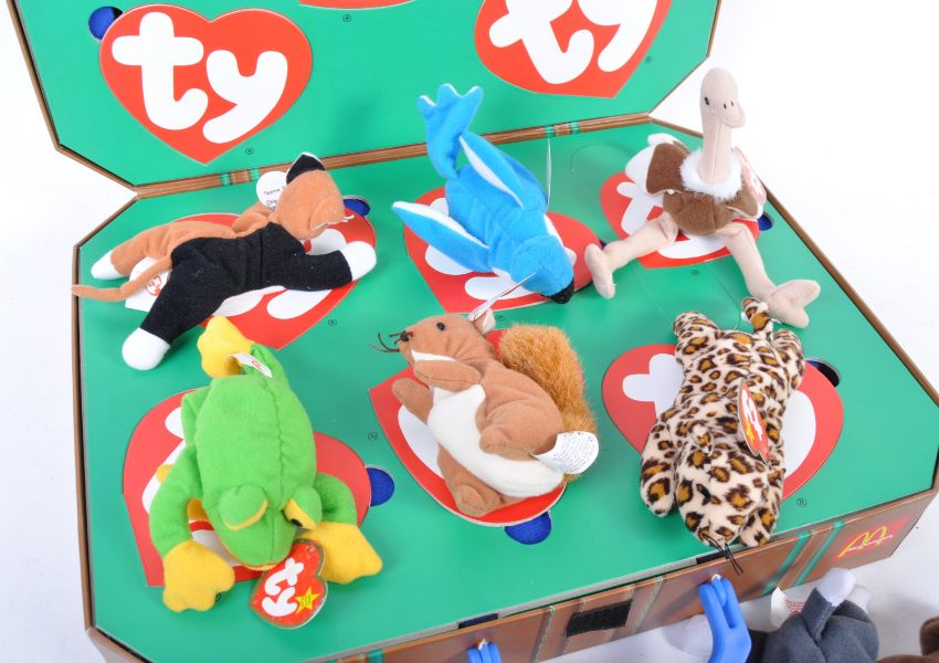 An original McDonalds Happy Meal Teenie Beanie Babies set within the official presentation case in the form of a travel suitcase. The set comprising of twelve mini animal Beanie Babies to include Smoochy the Frog, Chip the Cat, Rocket the Blue Jay, Strut the Rooster, Iggy the Iguana, Nook the Husky and more. All within the cardboard case having plastic carrying handles. With certificate of authenticity, serial no. 0840. Case measures 30.5cm x 40.5cm x 12.5cm.