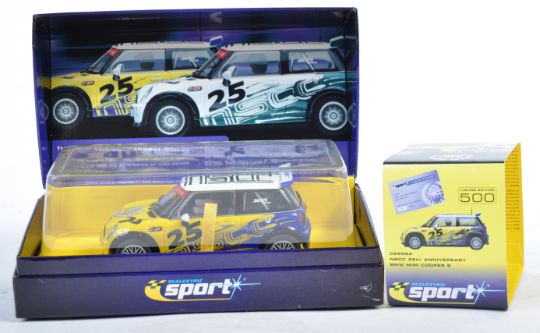 A Scalextric made 1/32 scale Limited Edition slot racing car No. C2599A ' NSCC 25th Anniversary BMW Mini Cooper S '. Contents appear mint and unused, within the original presentation box. Superbly detailed.