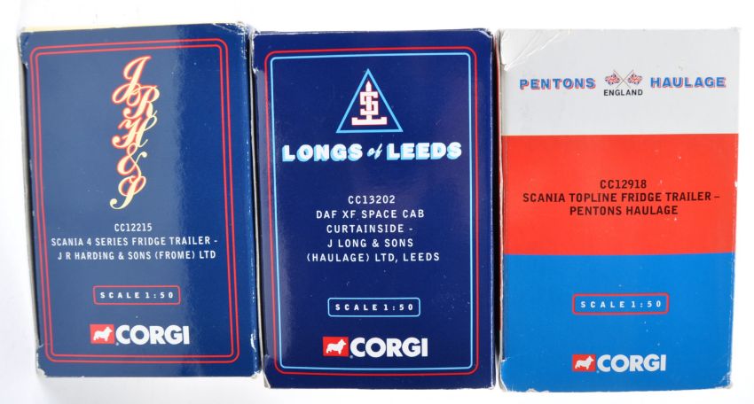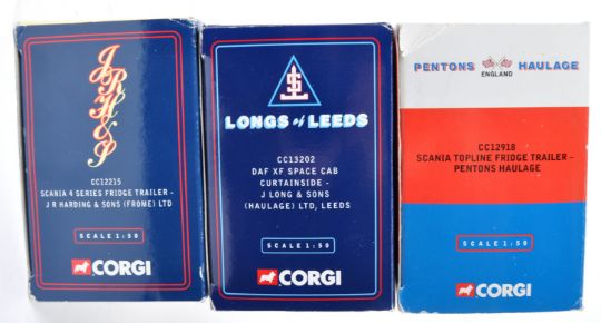 A collection of x3 Limited Edition Corgi Hauliers Of Renown 1/50 scale model truck / lorries to include:- CC13202 DAF EF Space Cab Curtainside - J Long & Sons Ltd- CC12918 Scania Topline Fridge Trailer - Pentons Haulage- CC12215 Scania 4 Series Fridge Trailer - J R Harding & SonsContents appearing mint, with Limited Edition certificates and original boxes. Highly detailed models.