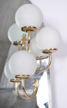 Veca - A contemporary Italian Art Deco style illuminating domed top wall mirror by Veca. The mirror of single panel form having a cluster of three light lamp sconces with brass arms and white glass ball shades. Measures 94cm x 68cm.